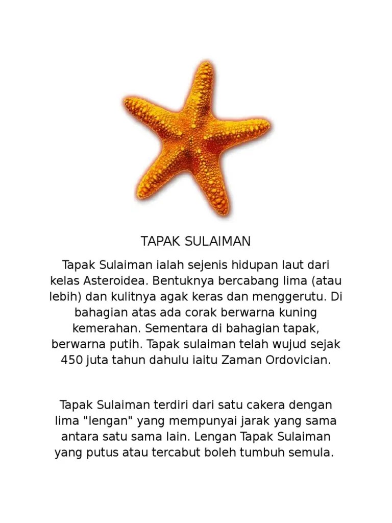 Tapak should mean sole in english, and it kinda makes sense that a starfish, . Why is starfish in malay called tapak sulaiman? Contextual translation of tapak sulaiman terletak di pantai into english. Check 'tapak sulaiman' translations into english. Tapak sulaiman translated to english ;
